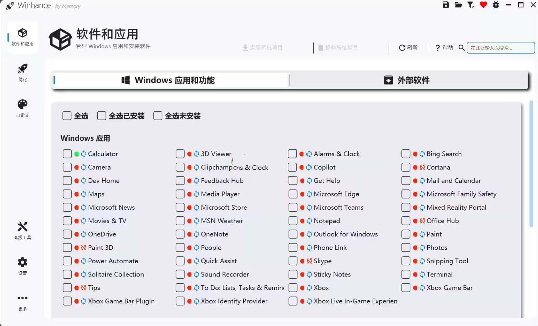 软件管理:可以管理Windows内置应用、功能和可选组件,还能通过Winget安装各类第三方实用软件。支持批量移除冗余软件。